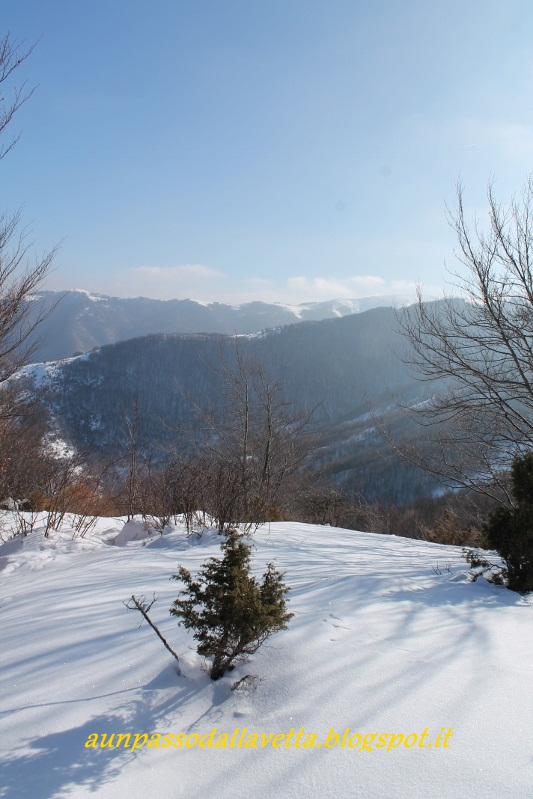 Il panorama si estende dalla val Curone alla val Borbera, totalmente imbiancate. Si distingue chiaramente il Monte Tobbio, con la sua caratteristica forma. Scorrendo con lo sguardo in direzione del mar Ligure, si vede la foschia schiarirsi, ma non abbastanza da lasciarmi intravedere Capo Noli. Dalla parte opposta, la prospettiva inganna e sembra che la palla-radar sulla cima del Monte Lesima e il Rifugio del Monte Chiappo siano l'una accanto all'altro, sulla stessa montagna.