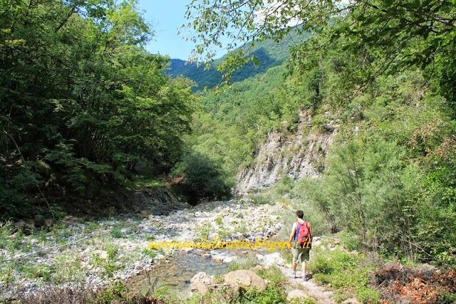 Ci fermiamo un attimo, mentre scatto qualche foto e ne approfittiamo per bere un sorso d'acqua, visto il grande caldo. Quando ripartiamo, fatichiamo a capire dove prosegua il sentiero e dopo qualche titubanza ci dirigiamo in direzione opposta rispetto al mulino, costeggiando il rio, fino ad attraversarlo una prima volta. Davanti a noi intravediamo la strada asfaltata che collega Agneto a Berga e Campassi, rispetto alla quale siamo decisamente più in basso. Ci troviamo nei pressi della confluenza del Rio dei Campassi con il Rio Berga, che scende dalla valle adiacente: i due corsi d'acqua, incontrandosi, danno vita al torrente Agnellasca. Dopo aver percorso un breve tratto sul greto del torrente, attraversiamo nuovamente il fiume con l'aiuto delle grandi pietre poste lungo il suo corso, portandoci sulla sponda opposta, proprio sotto alla strada asfaltata. Poche decine di metri ed eccoci sbucare sull'asfalto, accanto ad un cartello con l'indicazione per il mulino di Agneto e nei pressi del ponte sul Rio Berga: attraversiamo il ponte e seguiamo l'asfalto, in salita, per un breve tratto, fino a giungere nei pressi di una curva verso destra della strada. Qui, sulla sinistra, sono presenti le segnalazioni del sentiero 245 per Campassi.